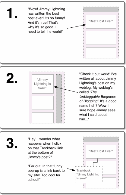 The answer lies in trackbacks. Trackbacks are a way of relating conversations across websites. After you publish your post, you send a trackback to my post. This is usually handled automatically by the blogging software. The trackback links our two posts together. I get notified of any trackbacks to my posts, so I can follow the trackback to read your response. Furthermore, trackbacks are public, just like comments. So any future readers can also follow our conversation thread by directly navigating from my blog to yours with a single click. Tom Coates created a little diagram which illustrates this process: