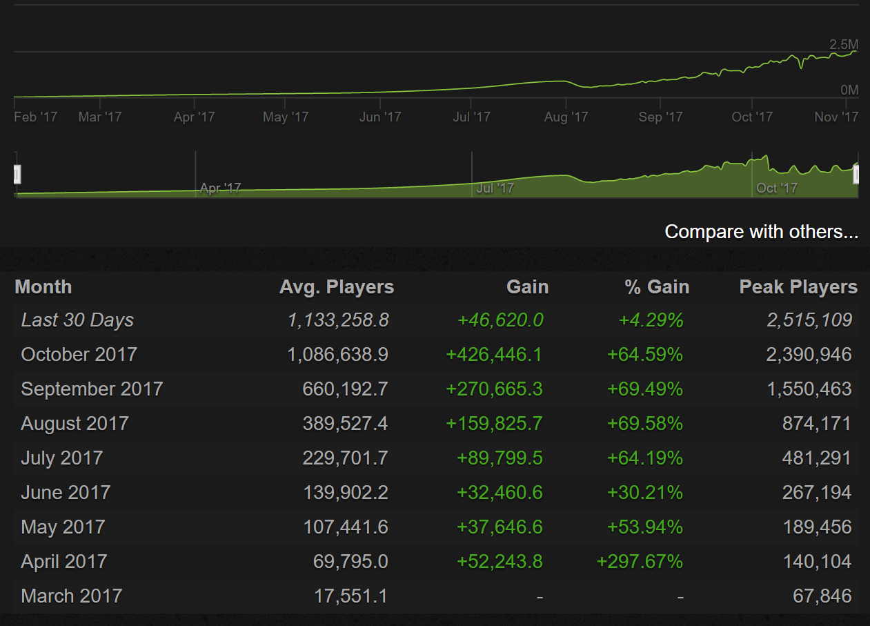 That game is Player Unknown’s Battlegrounds. I was increasingly curious why it was so popular, and kept getting more popular every month. Calling it a mere phenomenon seems like underselling it; something truly unprecedented is happening here. I finally broke down and bought a copy for $30 in September.