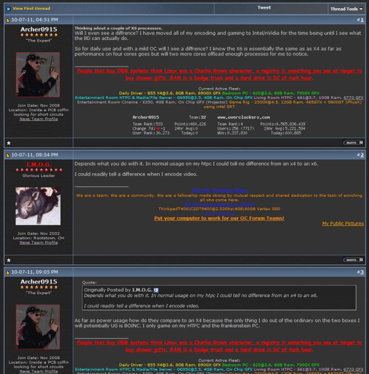 Based on the original size of those screenshots, only 18 percent of that forum thread page is content. The other 82 percent is lost to signatures, avatars, UI doohickeys, and other web forum frippery that has somehow become accepted as “the way things are done.” I regularly participate in several expert niche bulletin boards of various types today, and they’re all built the same way. Nobody complains.