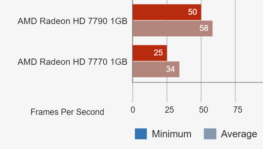 When I up the resolution to 1080p, I get 59fps average, 38 min, 71 max. Checking with Notebookcheck’s exhaustive benchmark database, that is closest to the AMD R7 250, a rebranded Radeon 7770.