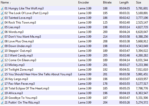 You’ll get no argument from me that the old standby of 128kbps constant bit rate encoding is not adequate for most music, even today, and you should be able to hear that in this test. But I also maintain that virtually nobody can reliably tell the difference between a 160kbps variable bit rate MP3 and the raw CD audio, much less 192kbps. If you’d like to prove me wrong, this is your big chance. Like the announcer in Smash TV, I say good luck – you’re gonna need it.