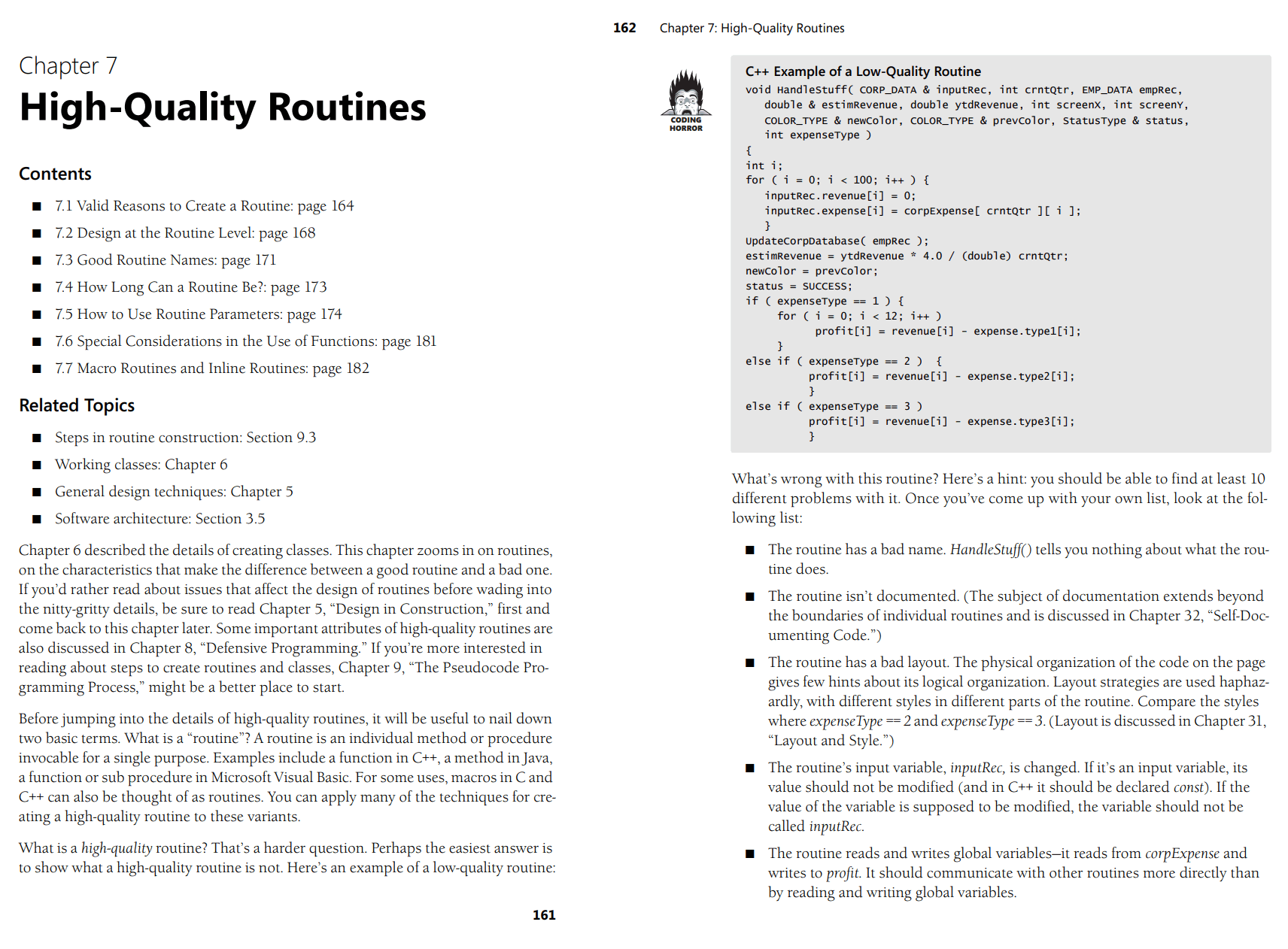 The humble routine is the backbone of all programming in any modern language. I’m sure you’re the very model of a modern major programmer, so I won’t bore you with a long explanation of why routines are a good idea. The original 1998 IEEE McConnell article covers the rationales behind routines quite well. There’s also a greatly expanded version of that material in Chapter 7 of Code Complete 2.