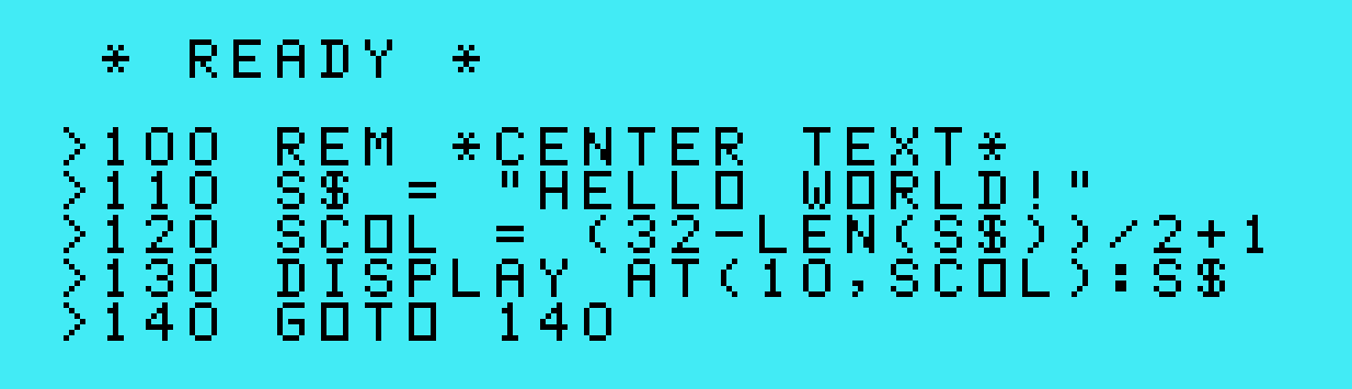 1000 NS% = (80 - LEN(T$)) / 2 1010 S$ = "" 1020 IF NS% = 0 GOTO 1060 1030 S$ = S$ + " " 1040 NS% = NS% - 1 1050 GOTO 1020 1060 PRINT S$ + T$ 1070 RETURN