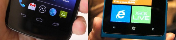 But once you add three buttons, thinking starts to creep in again. Am I pressing the correct button? That's never good. And I don't even know what that third button is supposed to be on the Android phone! I could possibly be in favor of the hard search button on the Windows phone, I suppose, but I'd rather see good, consistent use of two buttons on the face of a device before willy-nilly adding Yet Another Button. I think there's a reason the industry has more or less standardized on a two-button mouse, for example. (Yes, there is that pesky middle button, but it's a nice to have, not an essential part of the experience.)