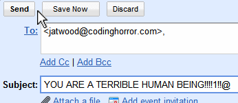 I can tell what you're thinking. Did he click Send or Save Now? Well, to tell you the truth, in all the excitement of composing that angry email, I kind of lost track myself. Good thing we can easily undo a sent mail! Oh wait, we totally can't. Consider my seat, or at least that particular rash email, ejected.