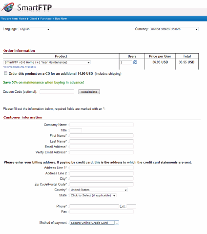 Until I register, I’m presented with this little nag screen every time I start SmartFTP. It’s mildly annoying, but tolerable – and it prominently features a convenient “buy me” button. Hey! That’s what I want to do!