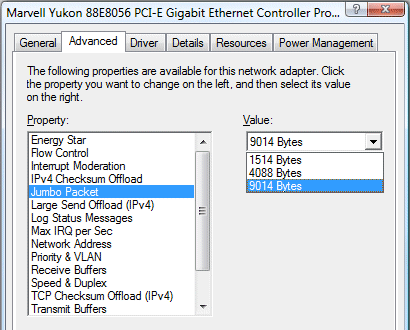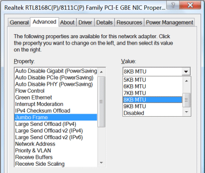 Once you’ve got those drivers up to date, look for the Jumbo Frames setting in the advanced properties of the network card. Here’s what it looks like on two different ethernet chipsets: