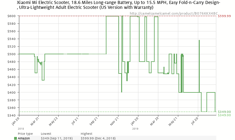 This graph only shows roughly two years, from January 2018 to now; it looks like the original price for the Xiaomi M365 when it hit the US market in early 2017 was around $800. So the price of a popular, common electric scooter has halved in three years. Very good news indeed for electric vehicles of all types!