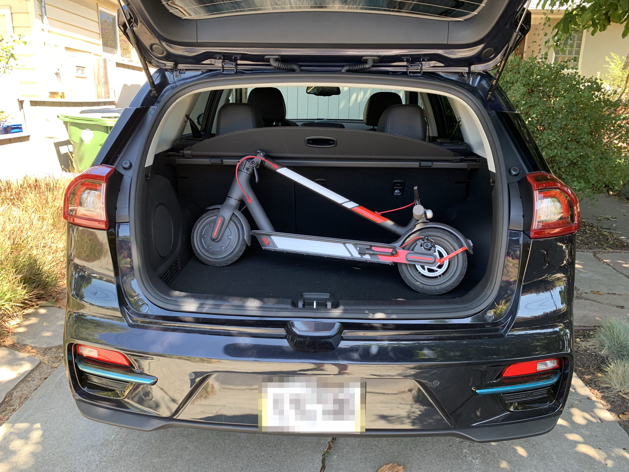 Here’s a picture of my electric scooter inside my electric car. (I apologize that I didn’t have an electric bicycle to park next to it for maximum smugness, but you can bet your sweet electrons I’ll work on that next!)