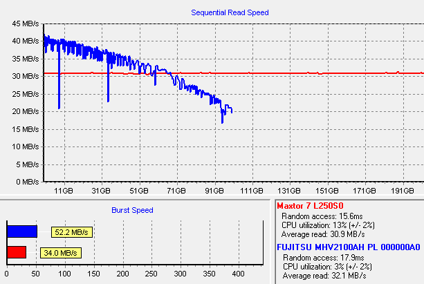 I’ve talked about the difference between USB 2.0 and full-blown SATA performance before. Here’s a direct comparison between a modern 250 gigabyte 7,200 rpm SATA drive in the Icy Dock (connected via USB), and my laptop’s internal 100 gigabyte 5,400 rpm hard drive: