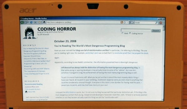 - Speaking of taxes, what about the Microsoft Tax? I'm already heavily infatuated with the current iteration of netbooks as represented by the Aspire. And they can only get better and cheaper over time. Imagine a machine with the same specs as the Aspire One but at $299, $199, maybe even $99. It's going to happen. It's inevitable. This is a huge opening for Linux; it's the ideal way to deliver a complete, modern web browser at nearly zero marginal cost to both the vendor and consumer.