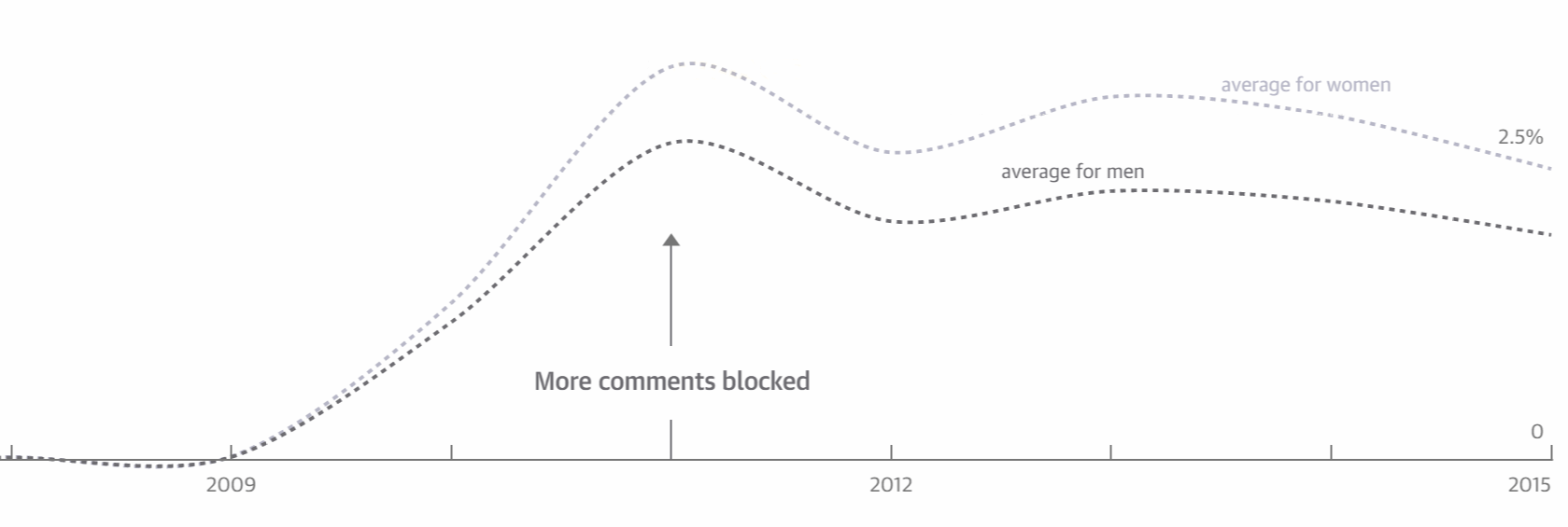 It's no coincidence that these are comments directed at women. Over the last few years I have come to understand how, as a straight white man, I have the privilege of being immune from most of this kind of treatment. But others are not so fortunate. The Guardian analyzed 70 million comments and found that online abuse is heaped disproportionately on women, people of color, and people of different sexual orientation.