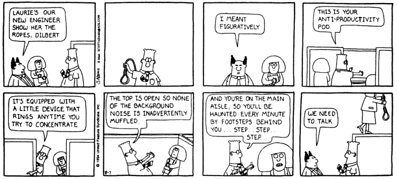 To be productive, people may come in early or stay late or even try to escape entirely, by staying home for a day to get a critical piece of work done. One of our seminar participants reported that her new boss wouldn't allow her to work at home, so on the day before an important report was due, she took a sick day to get it done. Staying late or arriving early or staying home to work in peace is a damning indictment of the office environment. The amazing thing is not that it's so often impossible to work in the workplace; the amazing thing is that everyone knows it and nobody ever does anything about it.
