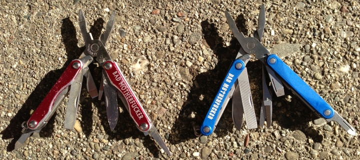 I also purchased an updated Leatherman Squirt PS4, the one with the integrated scissors as well as the pliers. I’m showing it here fully expanded, next to my old red Squirt that didn’t have the scissors.