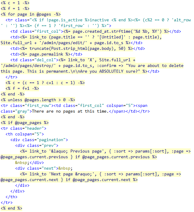 I’m not trying to single out Rails or Typo here; I could easily show you a ASP.NET MVC view that’s just as confusing (or as “clear,” if you think that’s perfectly readable, I guess). Tag soup is everywhere; take a look at the Python Django framework templates:
