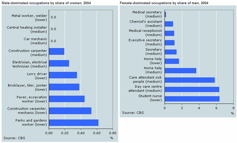 Consider this list of the most male and female dominated occupations in the Netherlands from 2004. It notes that: