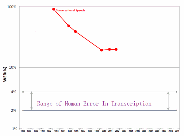 Despite ridiculous, order of magnitude increases in computing power over the last decade, we can’t figure out how to get speech recognition accuracy above 80% – when the baseline human voice transcription accuracy rate is anywhere from 96% to 98%!