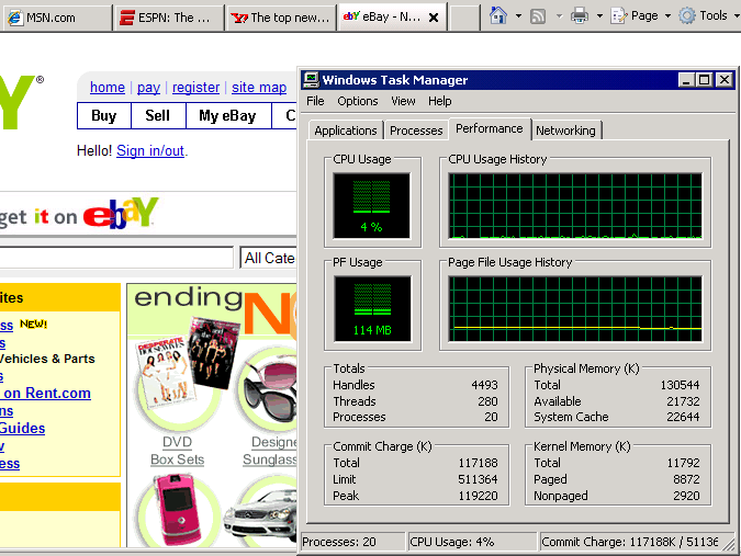 That’s with four tabs open to ESPN, eBay, Yahoo news, and MSN. Even with all that going on, I have more than 20 megabytes of free memory. And my commit charge total is well under the physical memory total. There’s still room for more stuff!