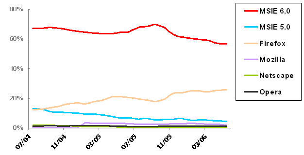 Quite a difference from the other browser market share statistics; IE 6.0 is dominant, but not overwhelmingly dominant to the tune of 95% market share at its peak in late 2004. It’s also interesting that despite being five years old and generally reviled by most serious web developers, IE 6 usage has only dipped ten percent from its historical peak on w3schools.