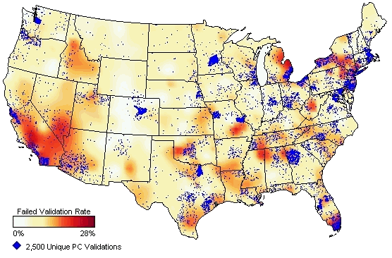 I found a Microsoft presentation on Windows Genuine Advantage (WGA) which goes into a lot more detail. It also provides this graph of WGA validation failure rates across the United States: