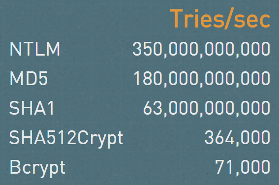 Now, to be fair, as I alluded to earlier all of this does depend heavily on the hashing algorithm that was selected. But you have to assume that every password you use will be hashed with the lamest, fastest hash out there. One that is easy for GPUs to calculate. There's a lot of old software and systems out there, and will be for a long, long time.