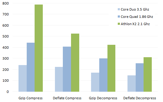 First I tested theGZipStreamand then theDeflateStream. I expected a minor difference because the two compression methods are different, but the result astonished me. I measured the DeflateStream to be 41% faster than GZip. That's a very big difference. With this knowledge, I'll have to change the HTTP compression module to choose Deflate over GZip.