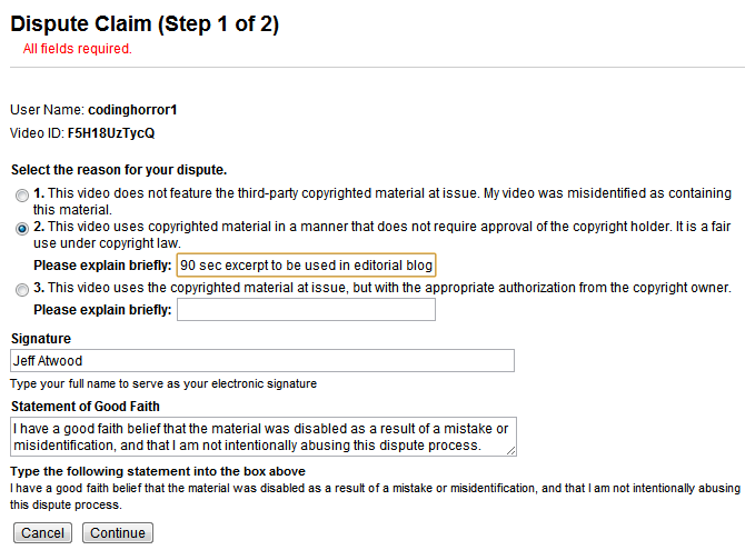 Although the 90 second clip I uploaded is clearly copyrighted content – I would never dispute that – my intent is not to facilitate illegal use, but to “quote” the movie scene as part of a larger blog entry. YouTube does provide recourse for uploaders; they make it easy to file a dispute once the content is flagged as copyrighted. So I dutifully filled out the dispute form, indicating that I felt I had a reasonable claim of fair use.